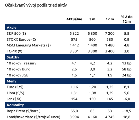 Globálne akcie môžu naďalej rásť vďaka silnému rastu ziskov. Odhadujeme, že negatívne vplyvy nových ciel kulminujú v treťom štvrťroku, potom by s rastúcou hospodárskou aktivitou mala prevládať fiškálna podpora. Očakávame, že téma umelej inteligencie bude naďalej hlavnou hnacou silou v USA (technológie predstavujú 35 % indexu S&P 500) aj vo svete (25 % indexu MSCI EM súvisí s technológiami).