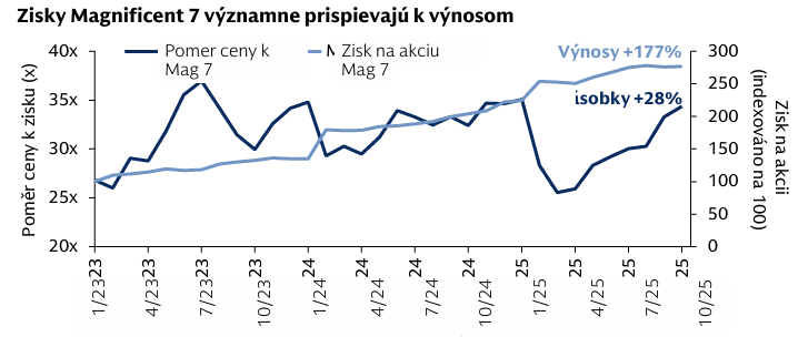 Základné piliere dnešného býčieho trhu nás vedú k optimistickému pohľadu na jeho udržateľnosť. Za posledný rok a celý cyklus sa zisky podieľali na celkových výnosoch amerických technologických spoločností približne tromi štvrtinami a s rastom ziskových marží vzrástli aj ich ocenenia. Hoci sa dnešné ceny môžu zdať vysoké, priemerný forwardový pomer P/E Magnificent 7 na úrovni 34x je stále výrazne nižší ako býval počas technologickej bubliny v roku 2000, keď sa akcie lídrov trhu obchodovali za viac ako 50-násobok zisku.