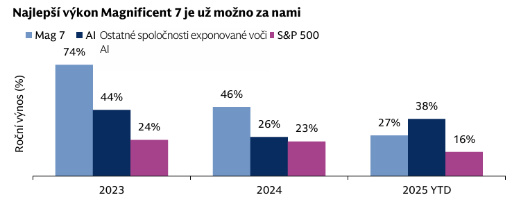 Magnificent 7 dosahovali posledných pár rokov vynikajúcu výkonnosť, pričom ich zisky a výnosy ďaleko prevýšili zvyšok trhu. S rastúcou konkurenciou a dozrievaním trhu však očakávame, že tento náskok sa bude znižovať a príležitosti pre AI sa budú rozširovať. V roku 2023 sa zisky Mag 7 zvýšili o 39 percentných bodov viac ako vo zvyšku indexu, ale v roku 2025 sa podľa konsenzu očakáva, že tento rozdiel bude len 11 p. b. Zároveň pokračuje rast ziskového a výnosového potenciálu ostatných akcií exponovaných voči AI.