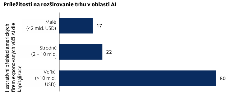 Poznámky k tretiemu grafu: Graf znázorňuje trhovú kapitalizáciu amerických spoločností v ilustračnom koši akcií exponovaných voči AI.