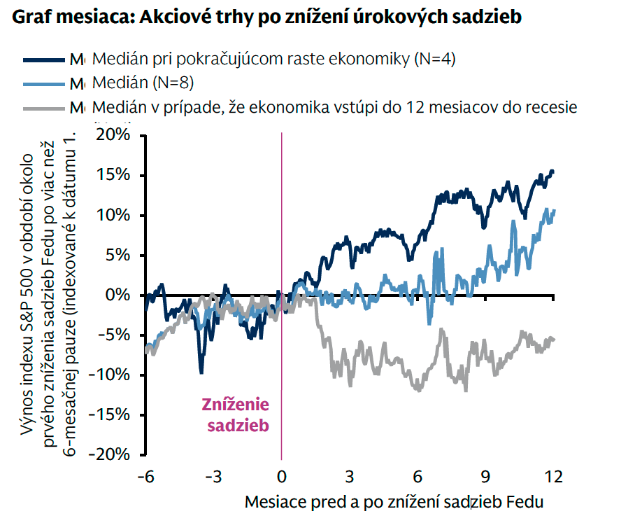 - Graf mesiaca: Zdroj: Goldman Sachs Global Investment Research a Goldman Sachs Asset Management. Ku dňu 30. septembra 2025. Graf zobrazuje výnosy indexu S&P 500 v 8 prípadoch v posledných 40 rokoch, keď Federálny rezervný systém znížil úrokové sadzby po ich stabilnom udržiavaní počas najmenej 6 mesiacov pred znížením. Dáta zníženia v analýze zahŕňajú 13. júl 1990, 29. september 1998, 3. január 2001, 6. november 2002, 25. jún 2003, 18. september 2007, 1. august 2019 a 18. september 2024. „N“ označuje počet období.
