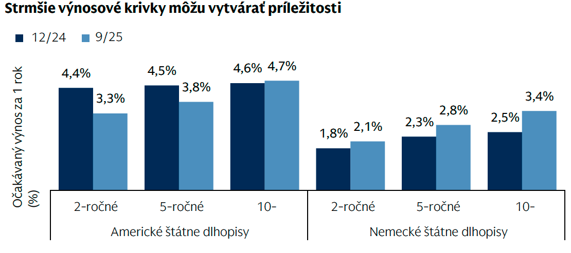 Globálne výnosové krivky sú strmšie, pretože zníženie sadzieb viedlo k poklesu krátkodobých sadzieb, zatiaľ čo dlhodobé sadzby zostávajú stabilné. Investori sú za predĺženie durácie odmeňovaní atraktívnymi výnosmi a ďalšími možnými kapitálovými ziskami. Aj keď investori môžu mať obavy z opätovného rastu výnosov, odhadujeme, že 10-ročné výnosy by museli v ďalšom roku vzrásť v USA o 60 bp a v Nemecku o 40 bp, aby kompenzovali dnešné zvýšené úrovne výnosov.