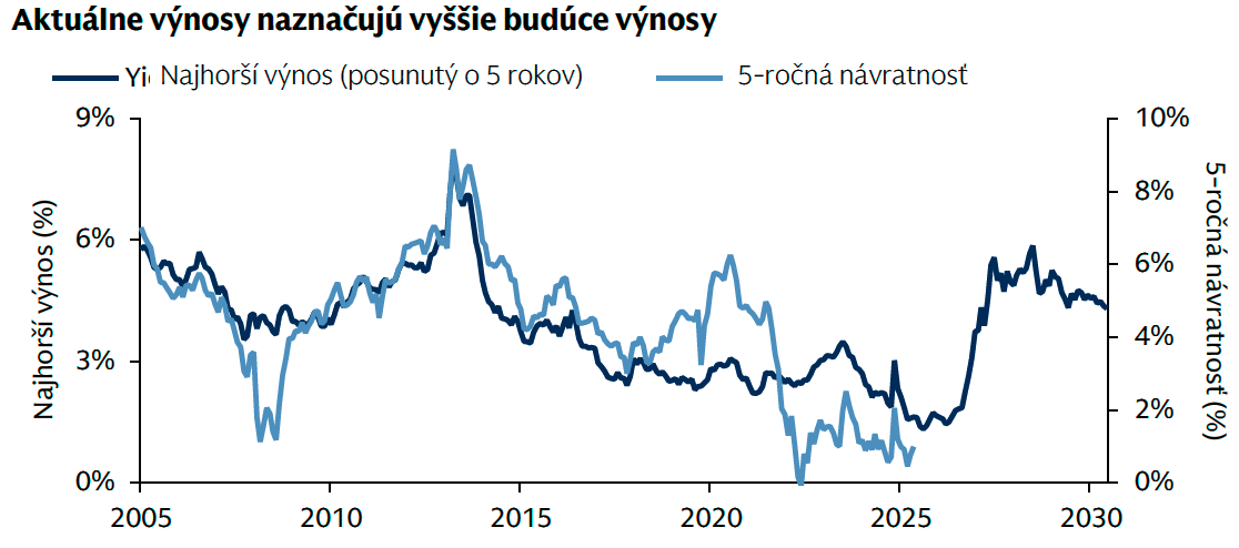 Investori do firemných dlhopisov naďalej hľadajú rovnováhu medzi výnosmi a riadením rizík. Aj keď sú spready nízke, najmä v USA, dlhopisové fundamenty zostávajú zdravé a výnosový potenciál majú dlhopisy IG aj HY. Historicky vykazuje výnos indexu Global Aggregate Corporate silnú koreláciu s budúcimi výnosmi. Vzhľadom na aktuálne výnosy sa domnievame, že tento vzťah naznačuje anualizované výnosy rádovo v stredných jednotkách percent v ďalších piatich rokoch.