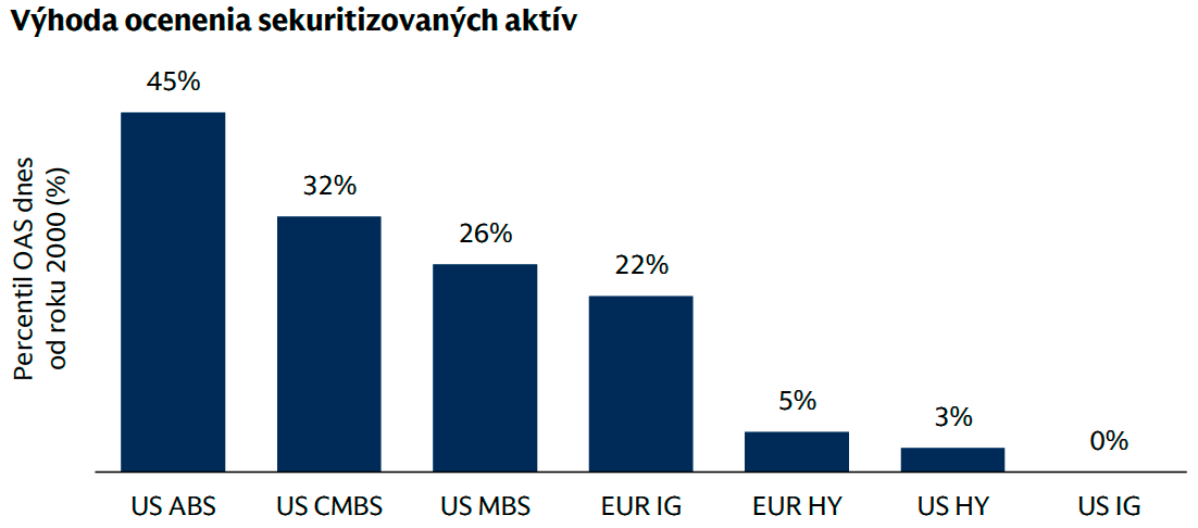 Súčasné ocenenie robí identifikáciu atraktívnych príležitostí stále náročnejšou. Americké sekuritizované dlhopisy však naďalej ponúkajú výhodu v oblasti ocenenia. Domnievame sa, že stabilizácia delikventných úverov, trvalý dopyt investorov a klesajúce úrokové sadzby by mali prispieť k zníženiu spreadov v rámci tejto triedy aktív. Spready amerických cenných papierov zaistených aktívami (ABS) a cenných papierov zaistených hypotékami (MBS) sa v súčasnosti pohybujú na úrovni 45., resp. 23. percentilu.